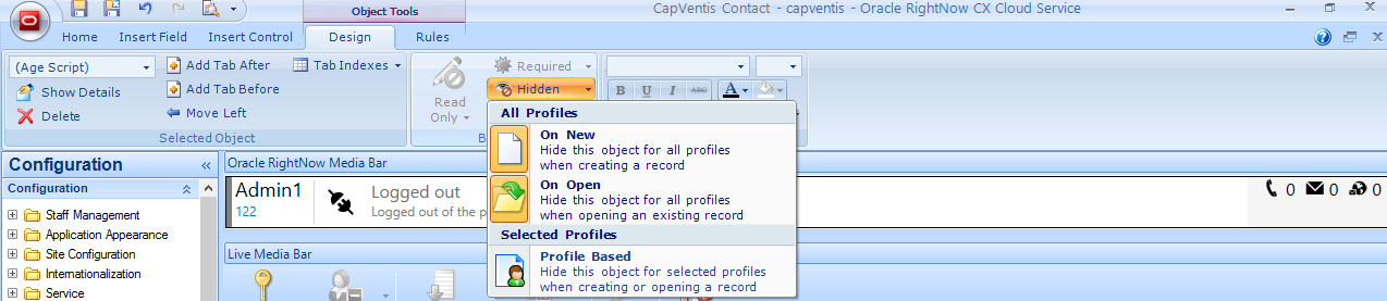 - Step 6: Select the new tab, go to the Design tab > Behavior section, click the Hidden button and make the tab hidden “On New” and “On Open“.