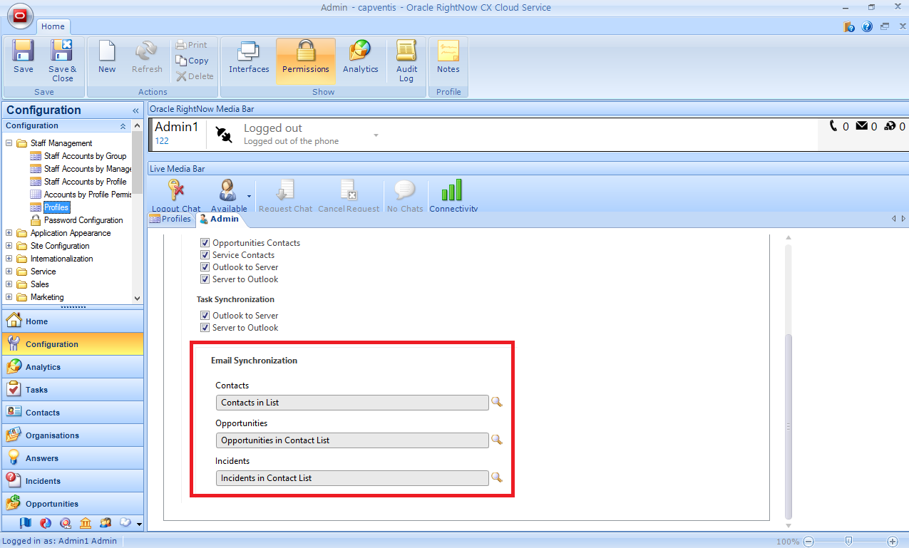 5. To allow staff members to share contacts between Outlook and RightNow, select one or more of the Contact Synchronization check boxes.