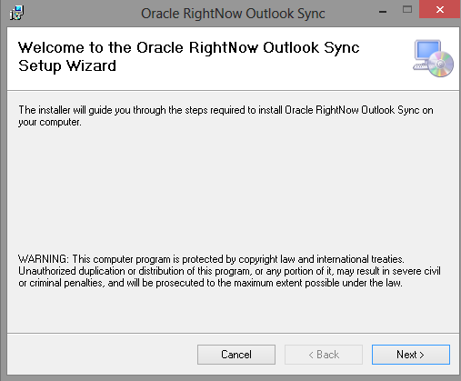 2. From RightNow CX, click the CX button and select Links > Install Outlook Integration. The RightNow Outlook Sync Setup wizard opens.