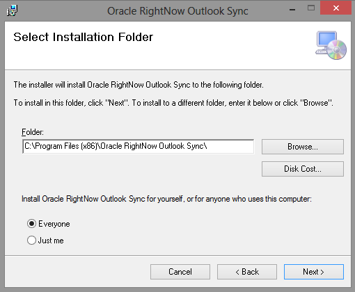 3. Click the Next button to open the Select Installation Folder window. (It is recommended that you install Outlook integration at the default location of C:\Program Files\Oracle RightNow Outlook Sync).