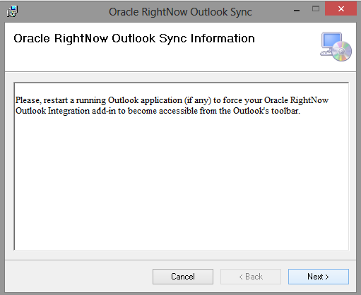 Microsoft Outlook can be integrated with Oracle RightNow CX Cloud Service, enabling you to share your contacts and tasks and synchronize your email. Using Outlook integration, your data will be more complete and up-to-date, and you’ll no longer need to switch back and forth between applications. You can also create contacts and incidents when syncing Outlook email with Oracle RightNow CX.