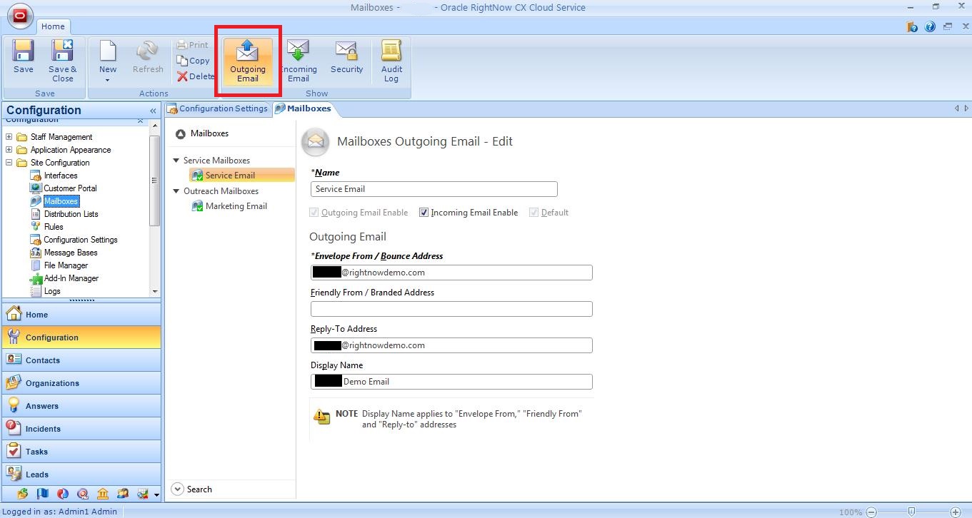 Mailboxes are used to define outgoing email settings and to specify the email accounts to pull email messages from. You cannot send or receive email from an application until at least one mailbox is configured and enabled for your RightNow CX interface.