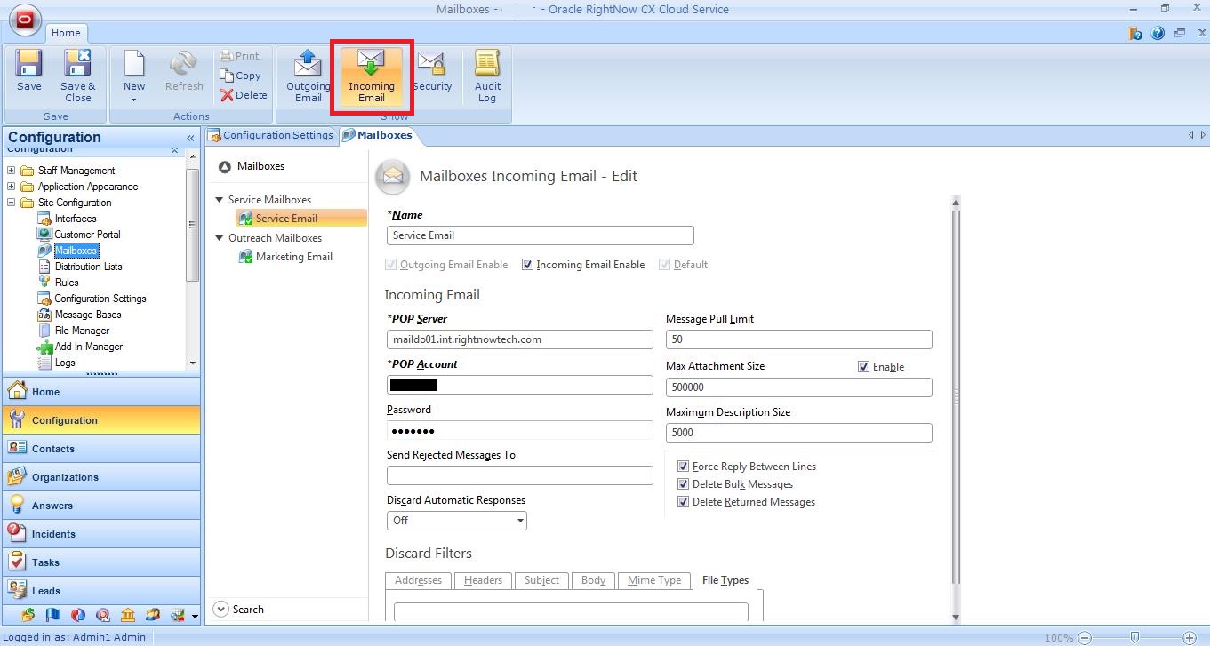 - Incoming email settings define the POP server, POP account, and password used to access incoming email. Other incoming settings provide methods to filter mail messages (by applying discard filters and restricting file attachments by size and file type) and forward rejected messages to another email address.
