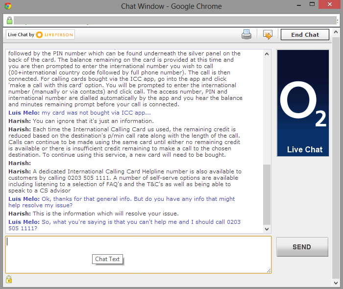 Requested a chat session from O2 to resolve a simple issue. O2 uses LivePerson to chat. Before starting the session it asks the Name, Number and Type of tariff. I filled all the fields “Luis Melo“, “07445……” and chose “Pay Monthly“. The chat agent greeted me and asked what was my issue, which I exposed.