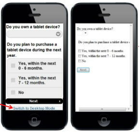 It is now possible to create surveys that will automatically optimised when accessed through mobile devices. RightNow is able to detect whether a survey is being taken on web or mobile device and adapt the landing and questionnaire pages. Nevertheless, there is an option to “Switch to desktop mode”
