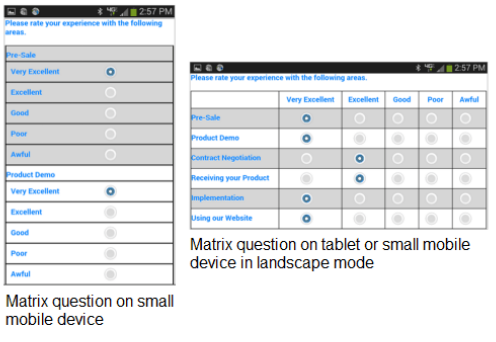 Matrix questions will be rearranged to display vertically on small mobile devices (less than 400 pixels).