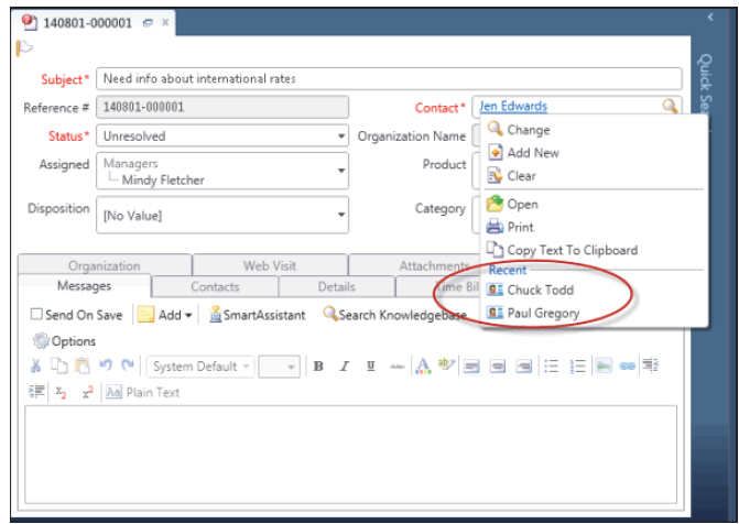 Sometimes a long list of values in a drop-down menu could be a pain for staff members, forcing them to scroll down to find the right value. The new release of Oracle Service Cloud brings an enhanced drop-down menu capability, displaying the last 10 selections at the top of the menu (in a section labelled “Recent”). Furthermore, the list of values will be sorted alphabetically and filtered as the staff member types the letters.