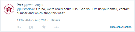 Pret reacted in a few hours, apologised straight away in public, and tried to take the follow up conversation offline – which is exactly what the social customer service best practices advises. So I sent the DM with my email address and the Pret’s shop location. Within a few minutes the response was there, thanking and advising me that the Customer Service team was informed and would take over.