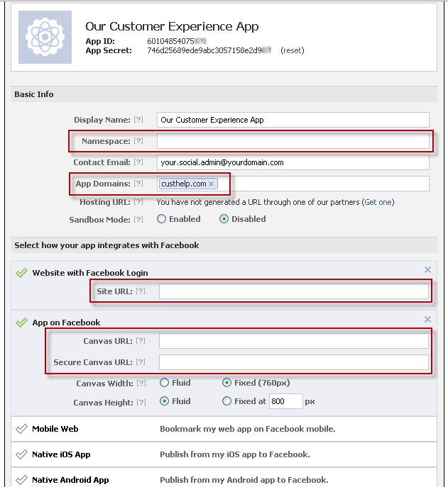 Secure Canvas URL: Type the secure URL for the Self Service for Facebook application in the following format: https:// < your_rightnow_site >.custhelp.com/cx/facebook/